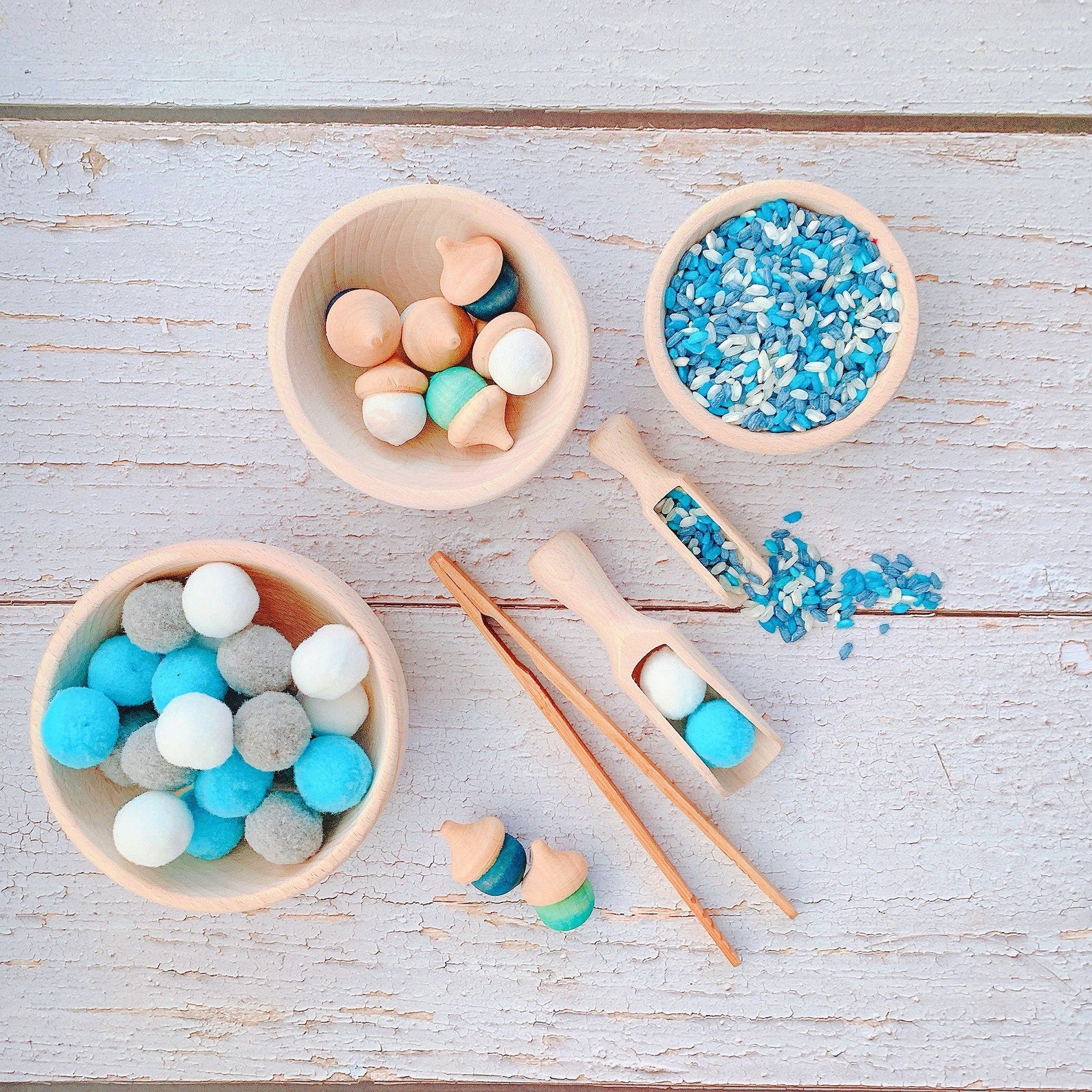 3 Nesting Wooden Bowls, Scoops & Tongs